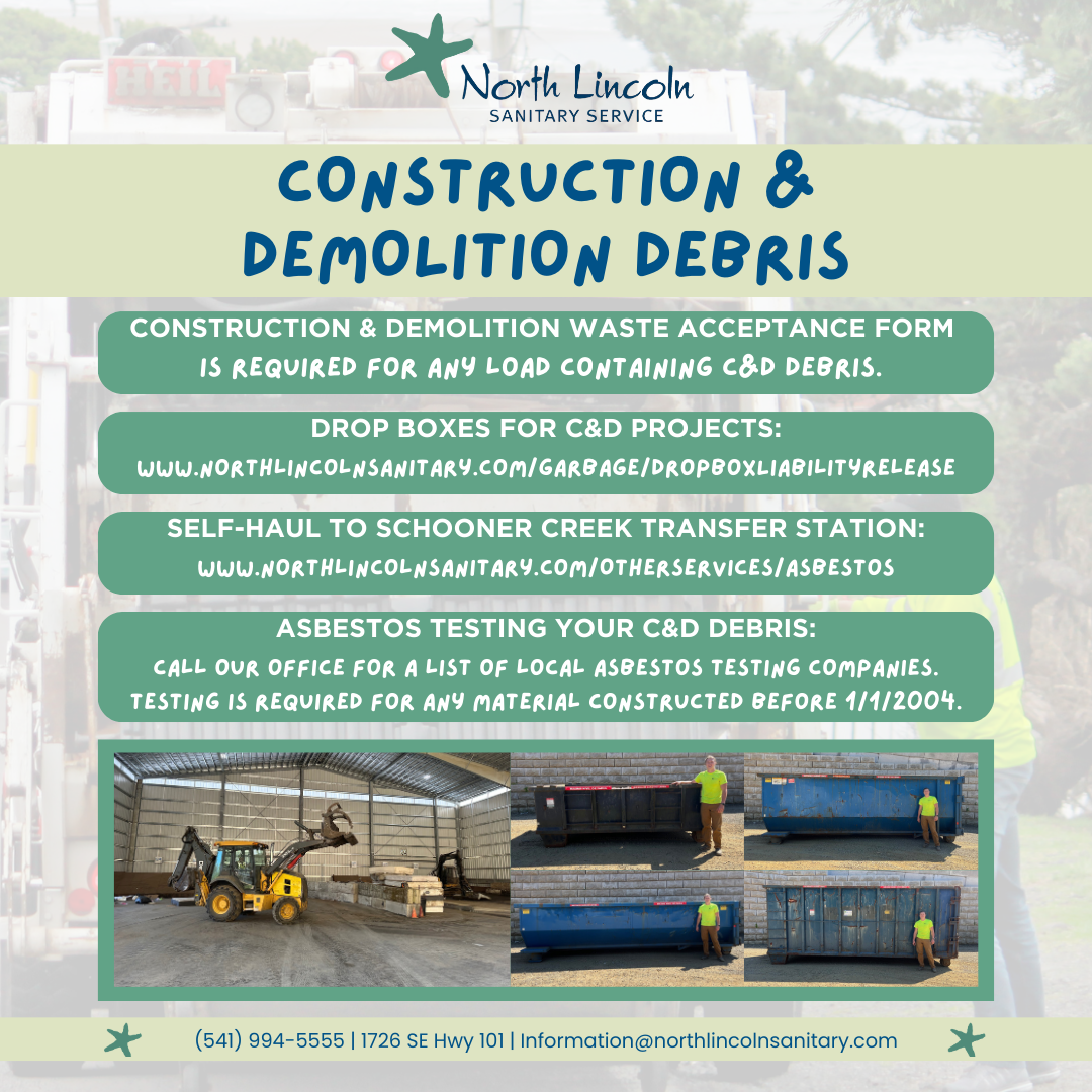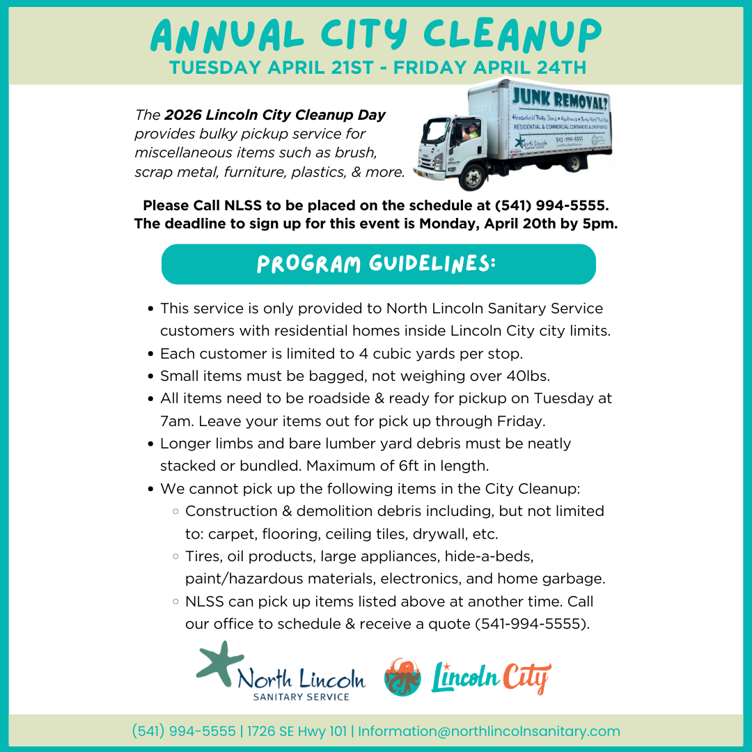 North Lincoln Sanitary Service offers garbage, recycling, mixed compost, junk removal, and transfer station services to residents and businesses of the North Lincoln County, Oregon area. Our sanitation service areas include Lincoln City, Depoe Bay, Otis, and North Lincoln County. Our family serving your family since 1965.